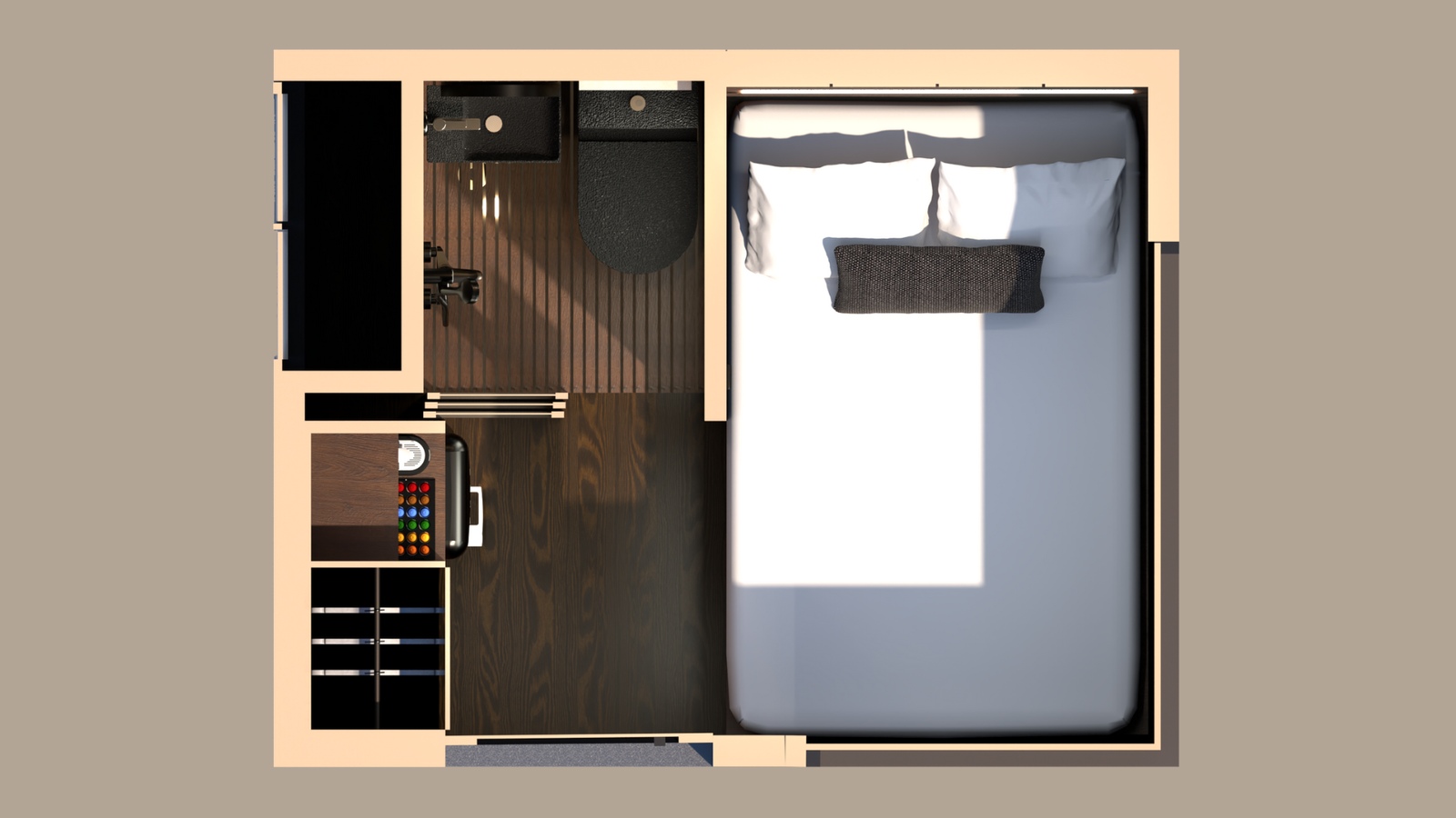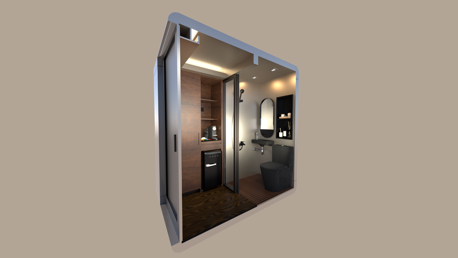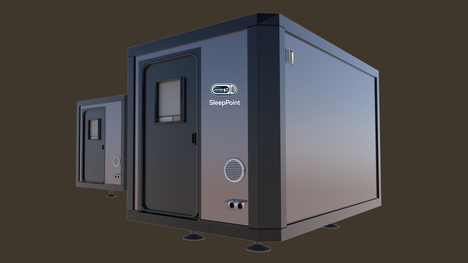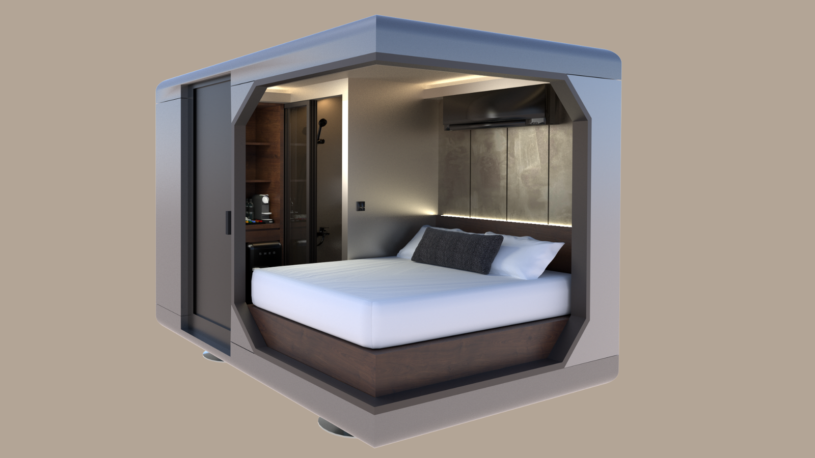 Cápsulas compactas, plegables y funcionales (2,3m x 1,4m x 1,4m) con una cama doble de 1,35m, ideal para 2 personas.